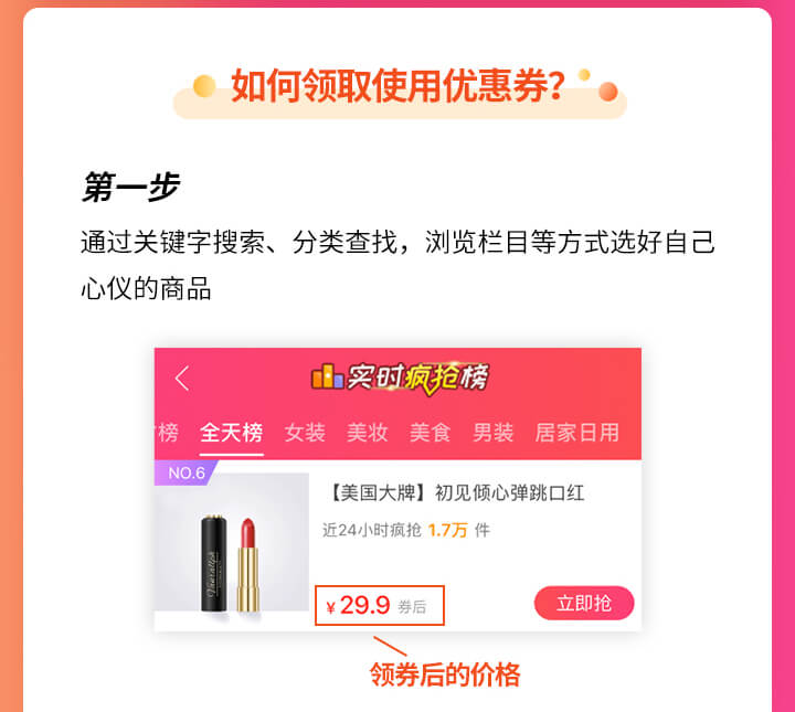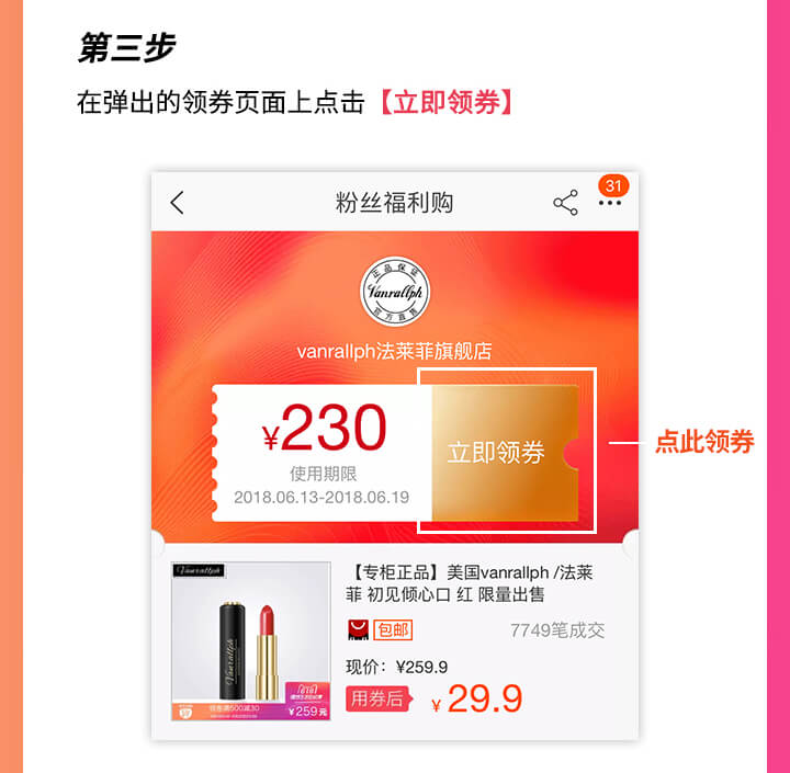 点击商品进入详情页,点击【立即领券】或【领券购买】,在粉丝福利购页面点击【立即领券】,即领券成功。