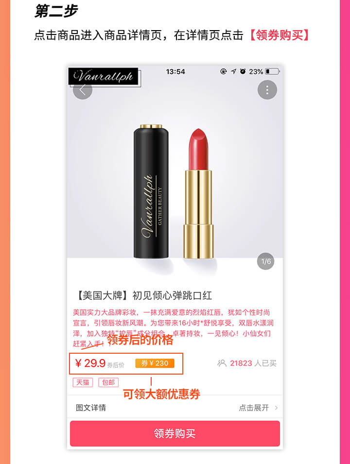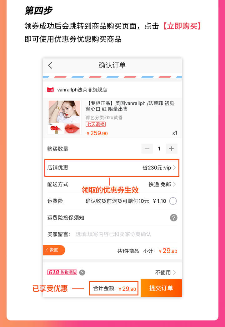 点击商品进入详情页,领券成功后自动跳转至淘宝商品详情页,点击立即购买,下单自动使用优惠券哦。