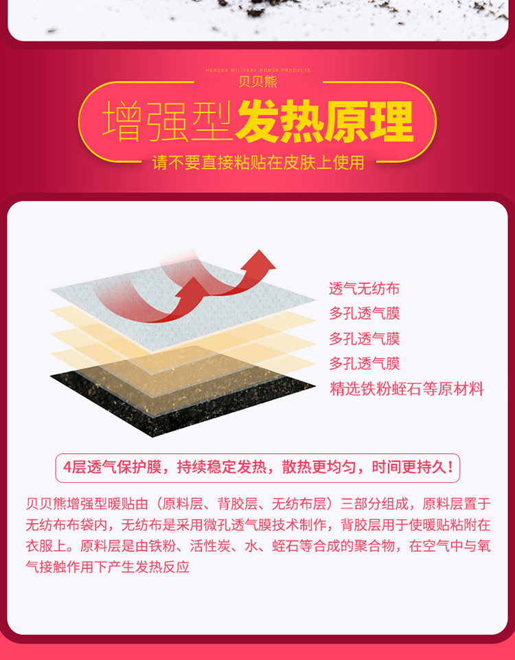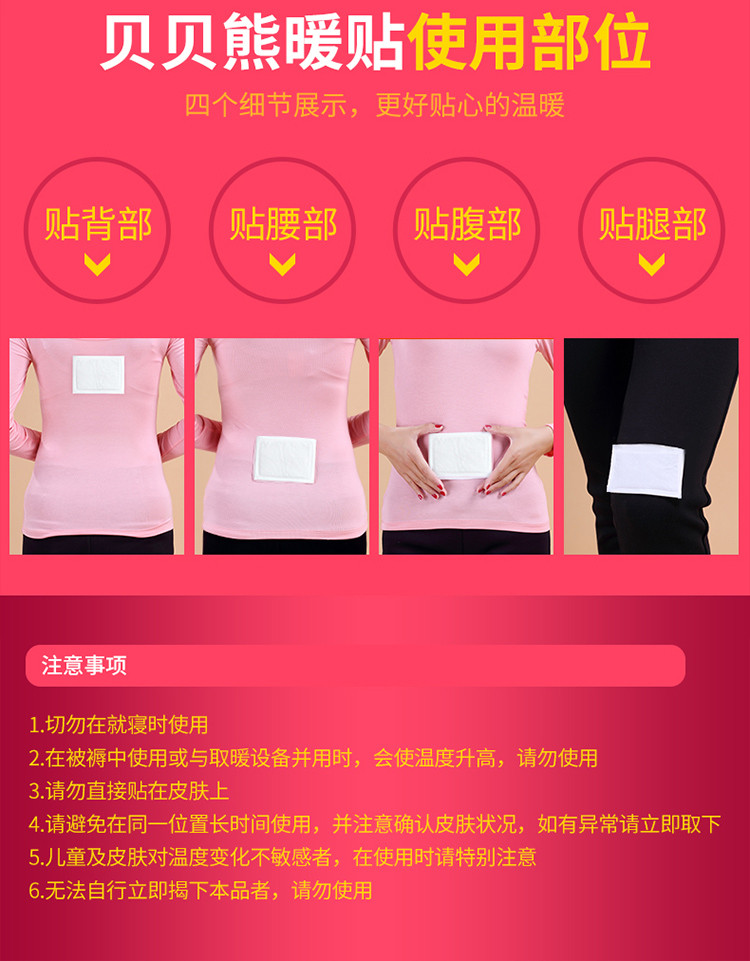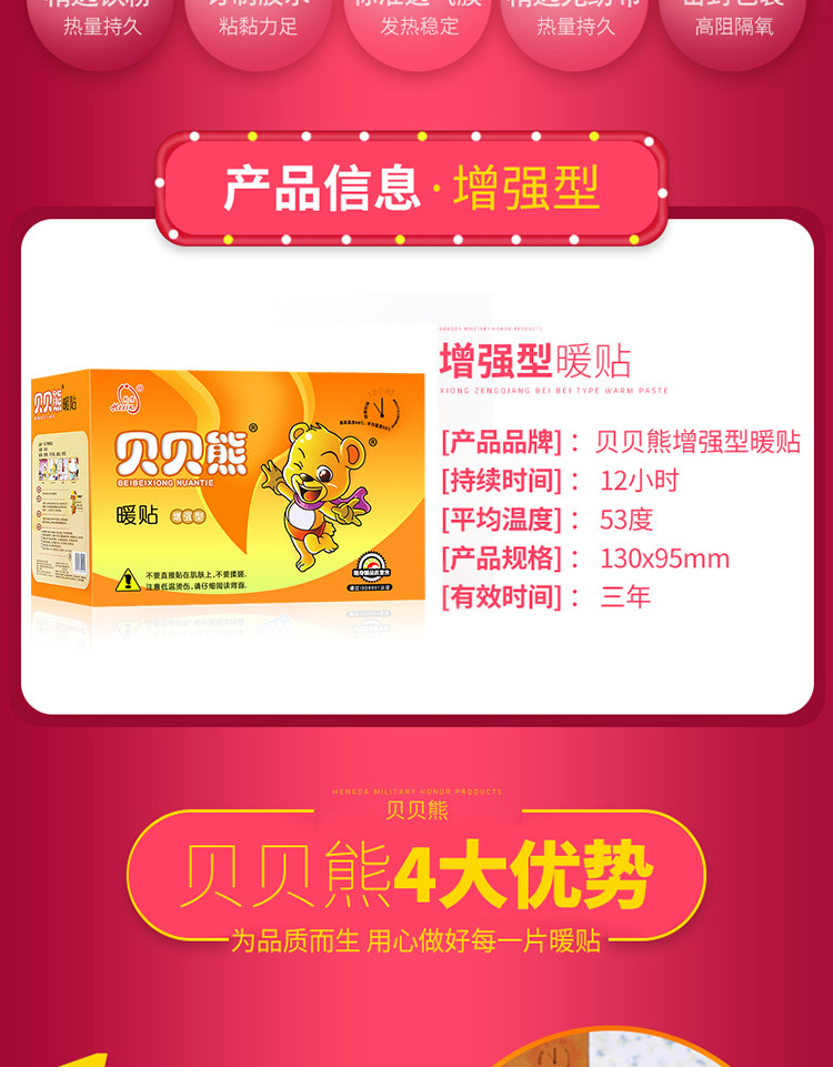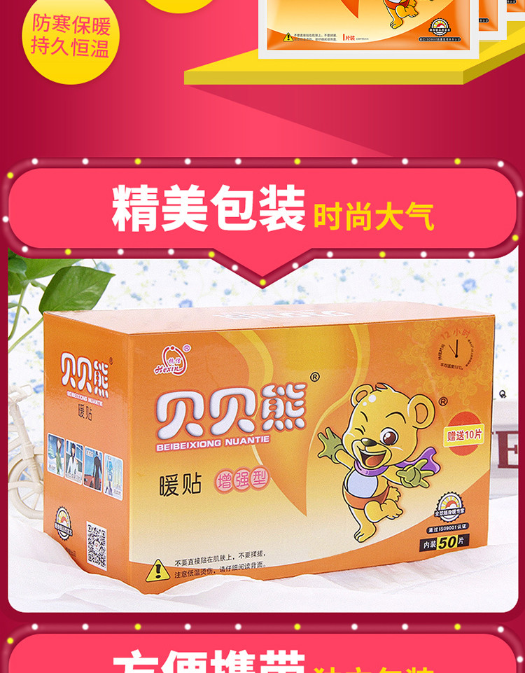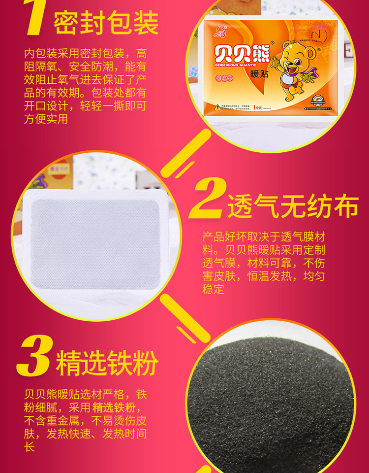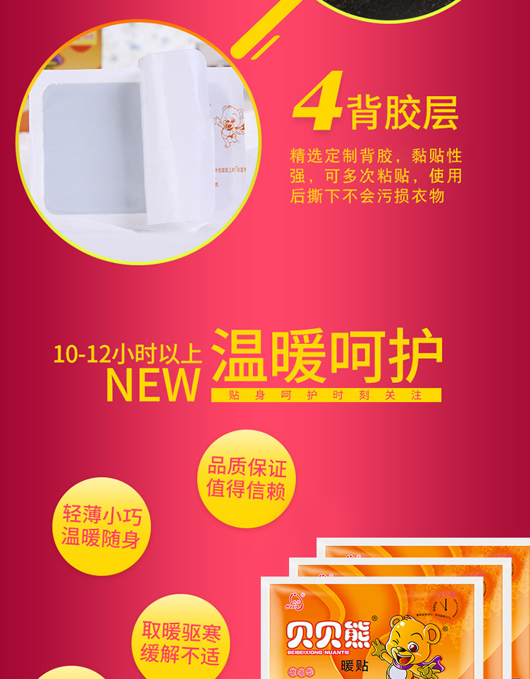 我们在北方,冬天特别冷。以前买了好多牌子的暖贴,但是质量都不是很好。 自从用了贝贝熊暖贴后,这个暖贴发热时间长,即使用完也非常暖,不折叠,不掉落。 买了好多次了,质量嗷嗷好。
