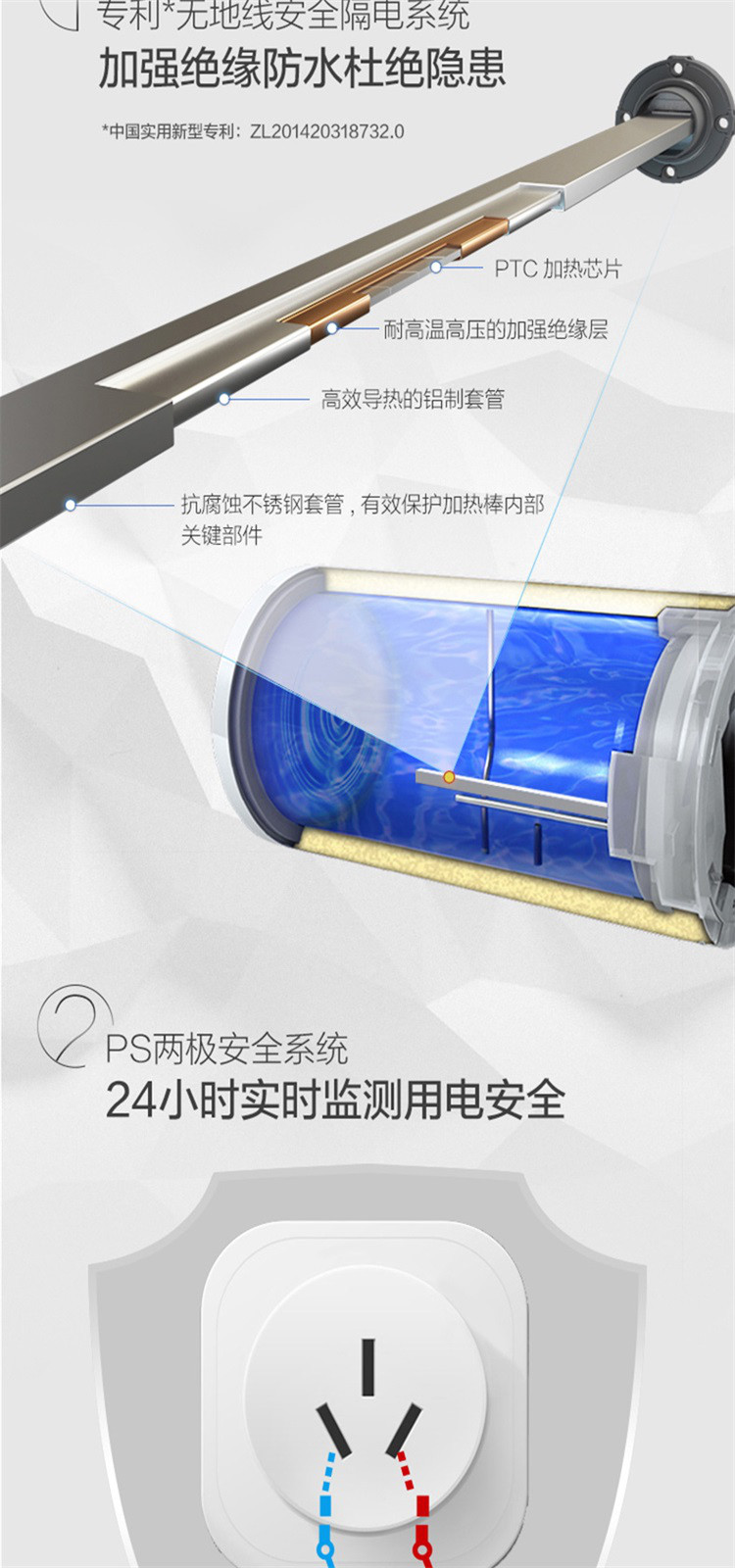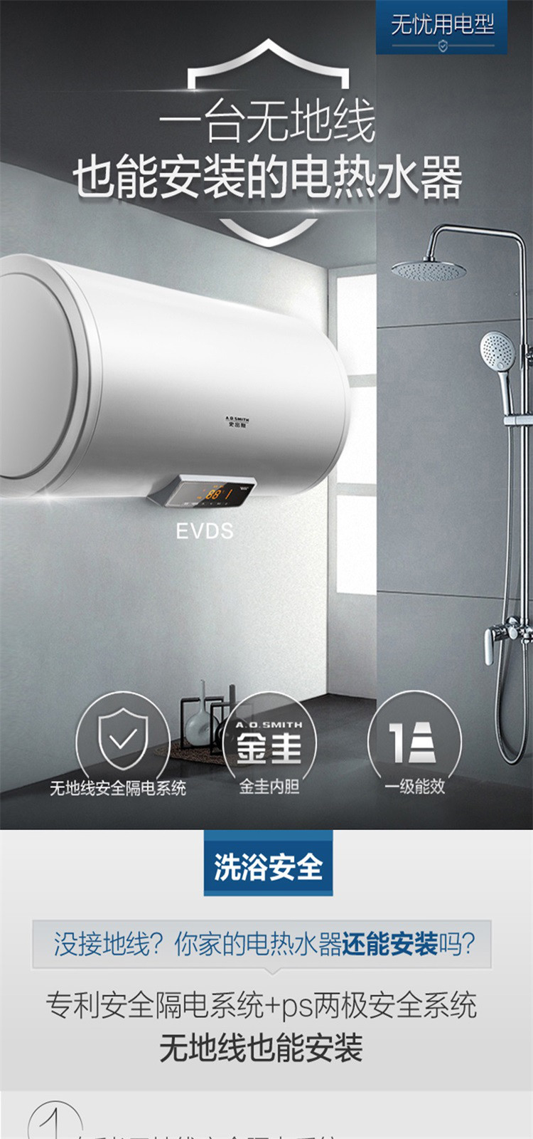 A.O.SMITH 史密斯50升60升80升电热水器家用洗澡EVDS 无地线可安装 安全隔电