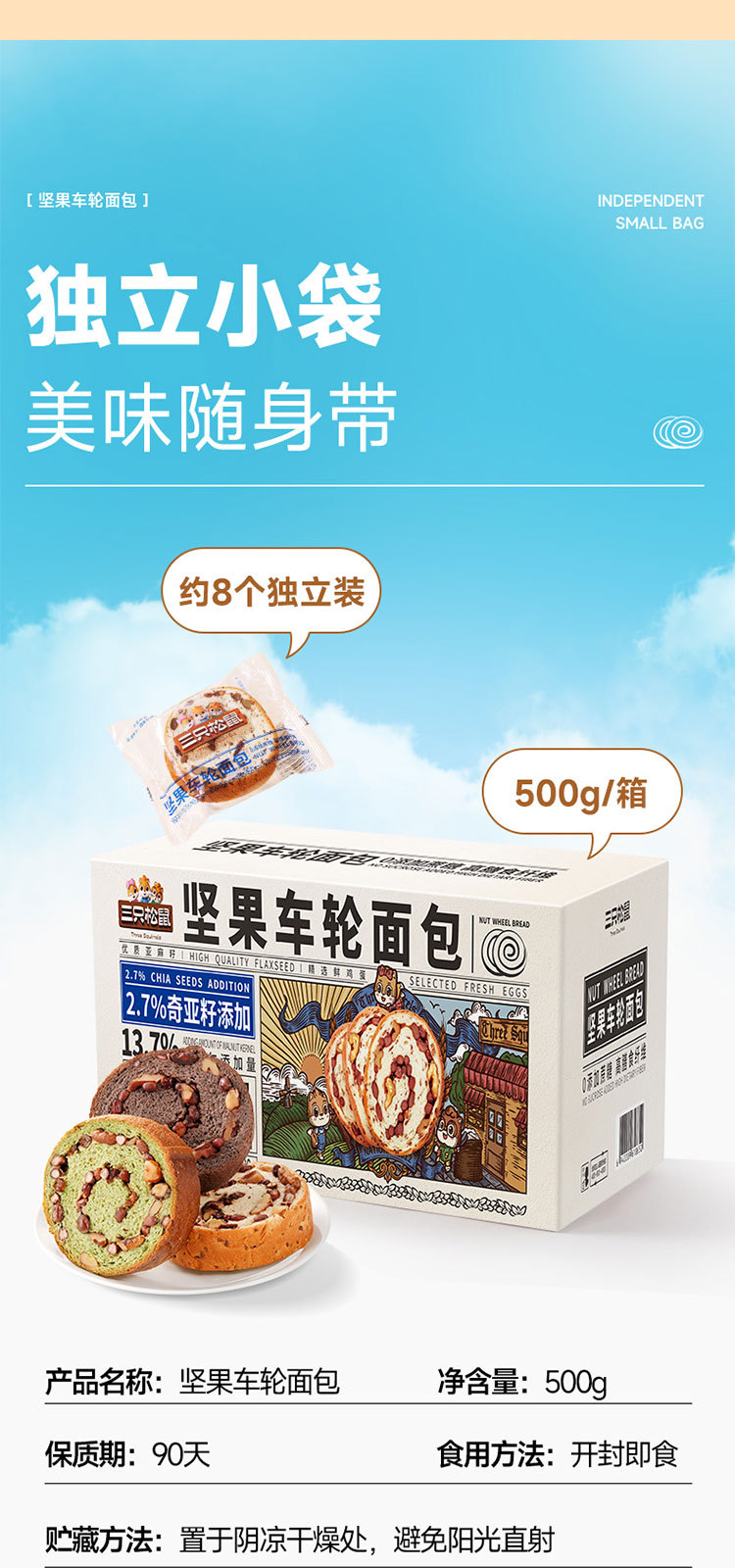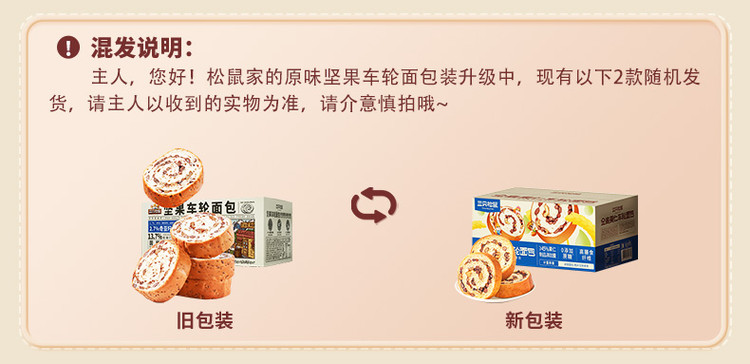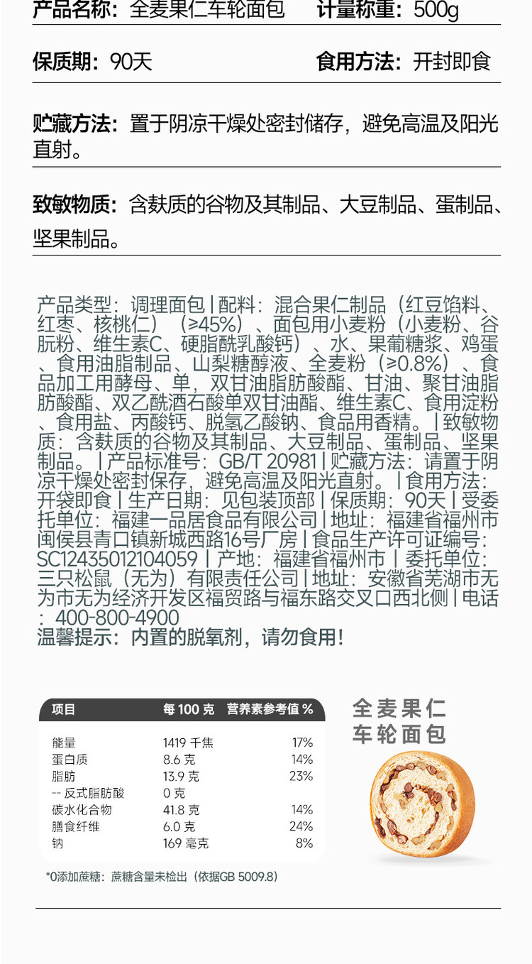 三只松鼠 【坚果车轮面包500g】核桃果仁健康零食粗粮吐司早餐代餐饱腹