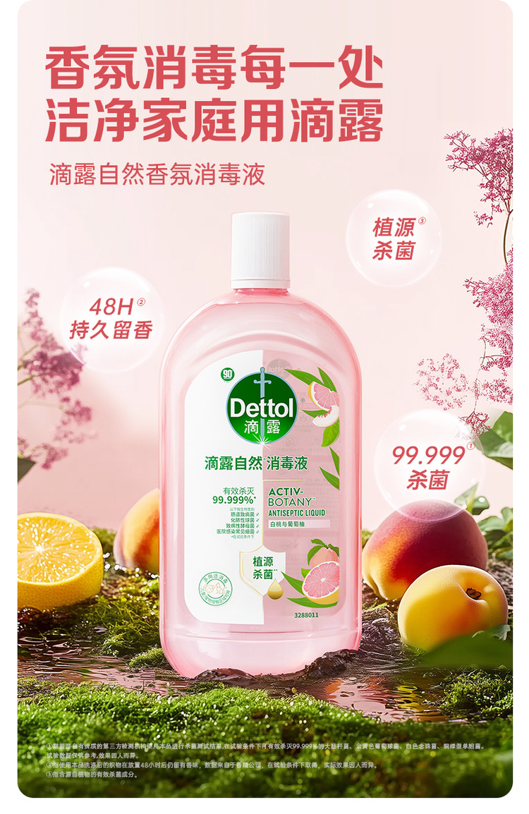 Dettol 【杀菌99.999%】滴露自然消毒液 白桃与葡萄柚香氛1L*2+湿巾