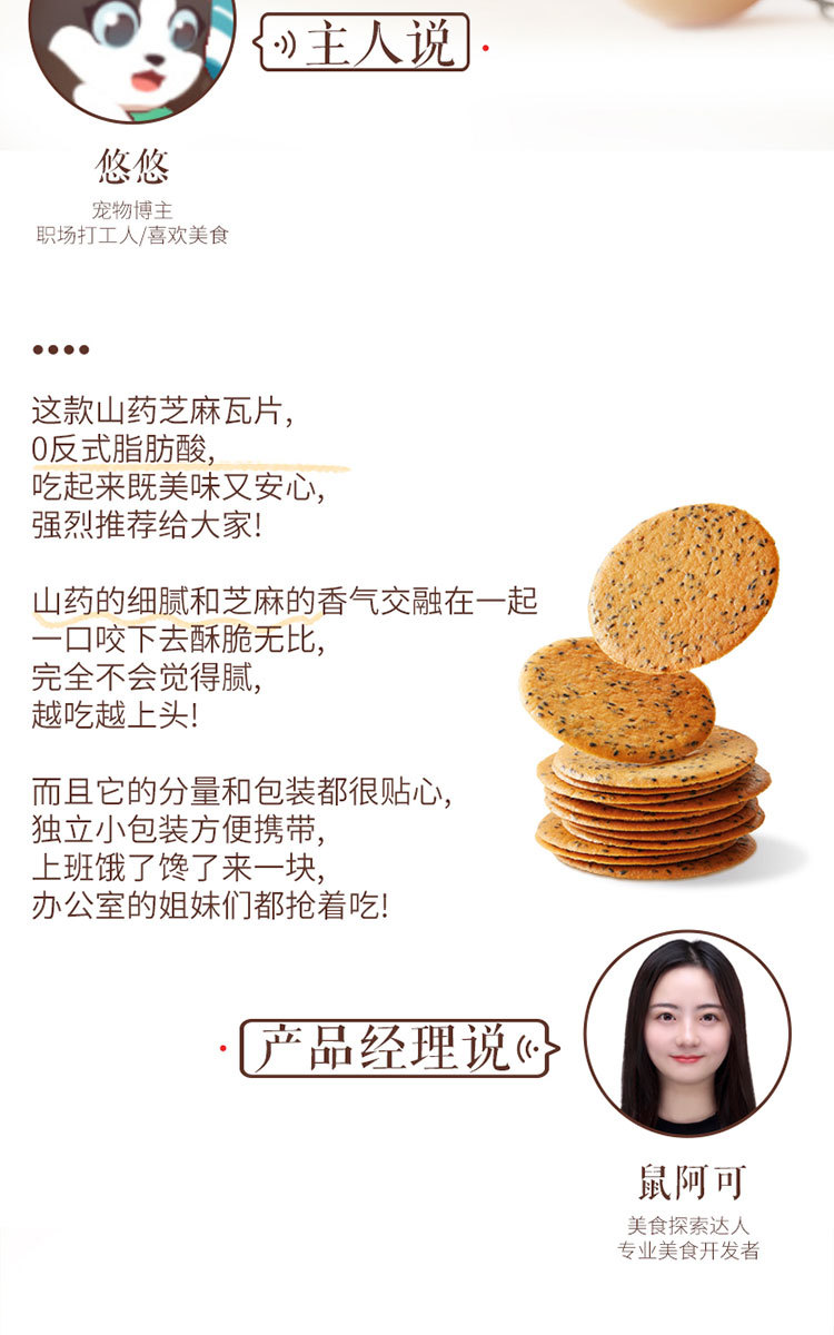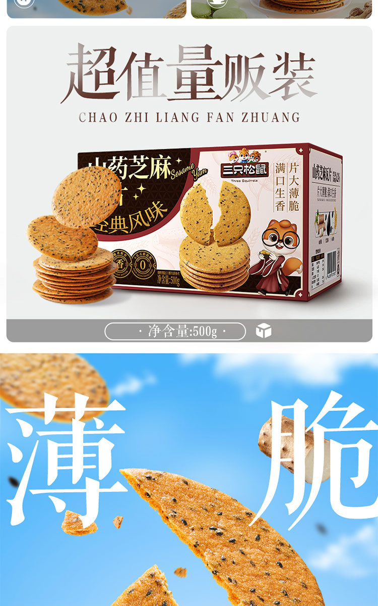 三只松鼠这款山药大薄脆饼干太好吃了!稀酥崩脆,香酥可口!营养又健康!独立包装方便储存,分量十足包装完好!吃完回购,推荐购买,品牌值得信赖!