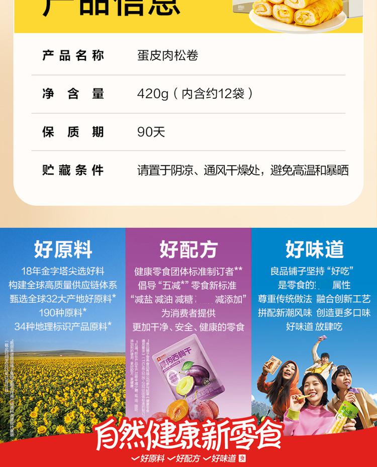 良品铺子的零食零嘴不容质疑🧐都是优良食品.特别是这款蛋皮肉松卷420g/箱.那是我我们全家滴最爱啊❤️😋不管是它的味道还是品质份量存储都是最佳最棒滴呀👍👍👍所以每逢节假日优惠日.我都毫不犹豫地下单购买2箱装的(这已经是n次购买了)生怕错过了良机良品.吃完了下回再来还来购买啊👌👌✌✌✌