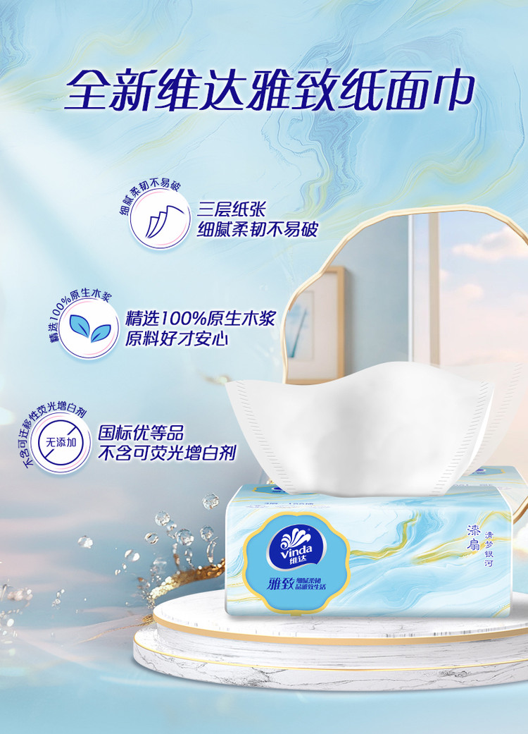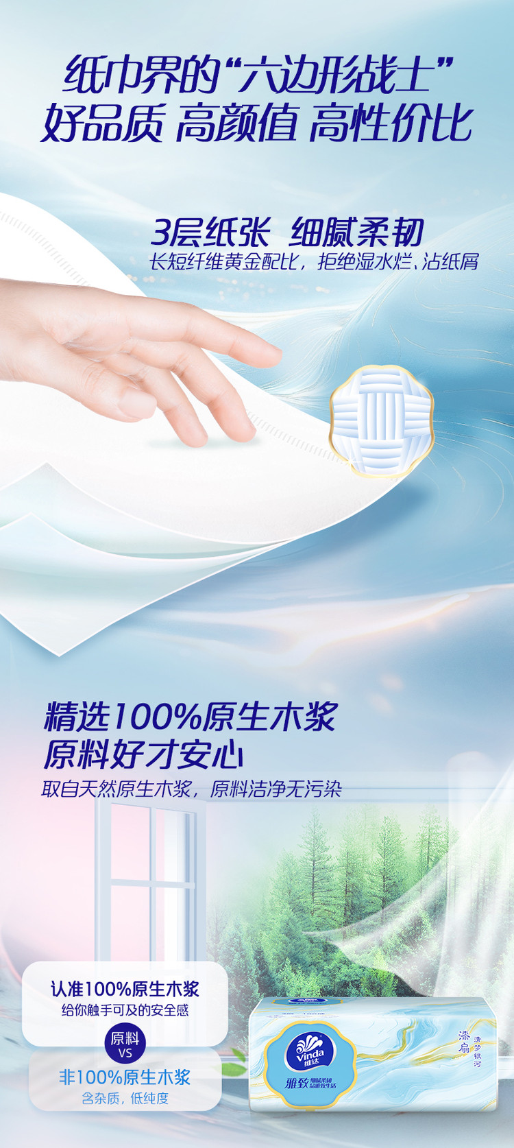 已经是N次回购维达这款抽纸了!国风水墨包装太有质感,粉蓝配色温柔又雅致,摆在家里都像个小装饰,颜值党狂喜✨ 纸质厚实柔软,3层设计韧性十足,擦脸、擦手都亲肤不掉屑,湿水后也不容易破,用来清洁桌面、餐具都很耐用。均码大小刚好,日常取用不浪费,性价比超高,已经把家里的抽纸都换成这款了,闭眼囤不踩雷!