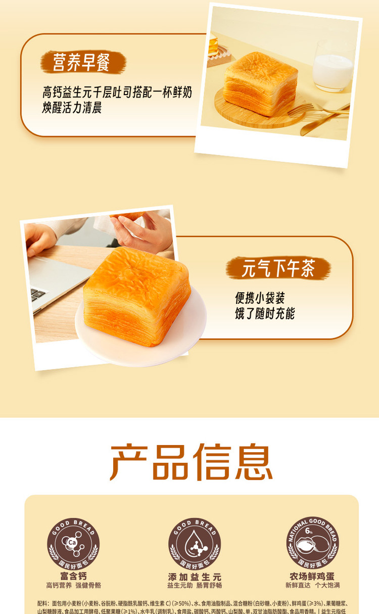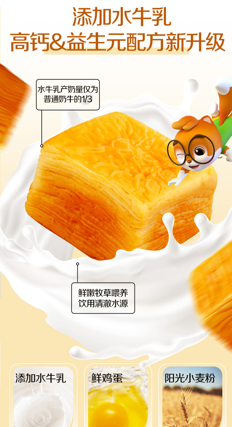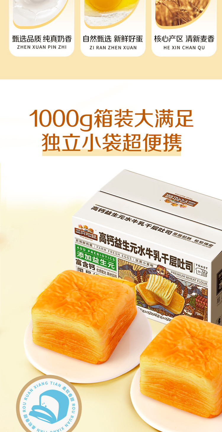 三只松鼠 水牛乳千层吐司1kg益生元高钙面包早餐糕点心饱腹零食品