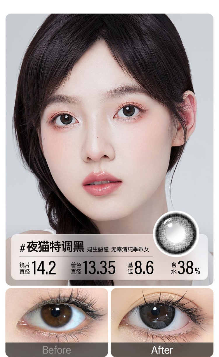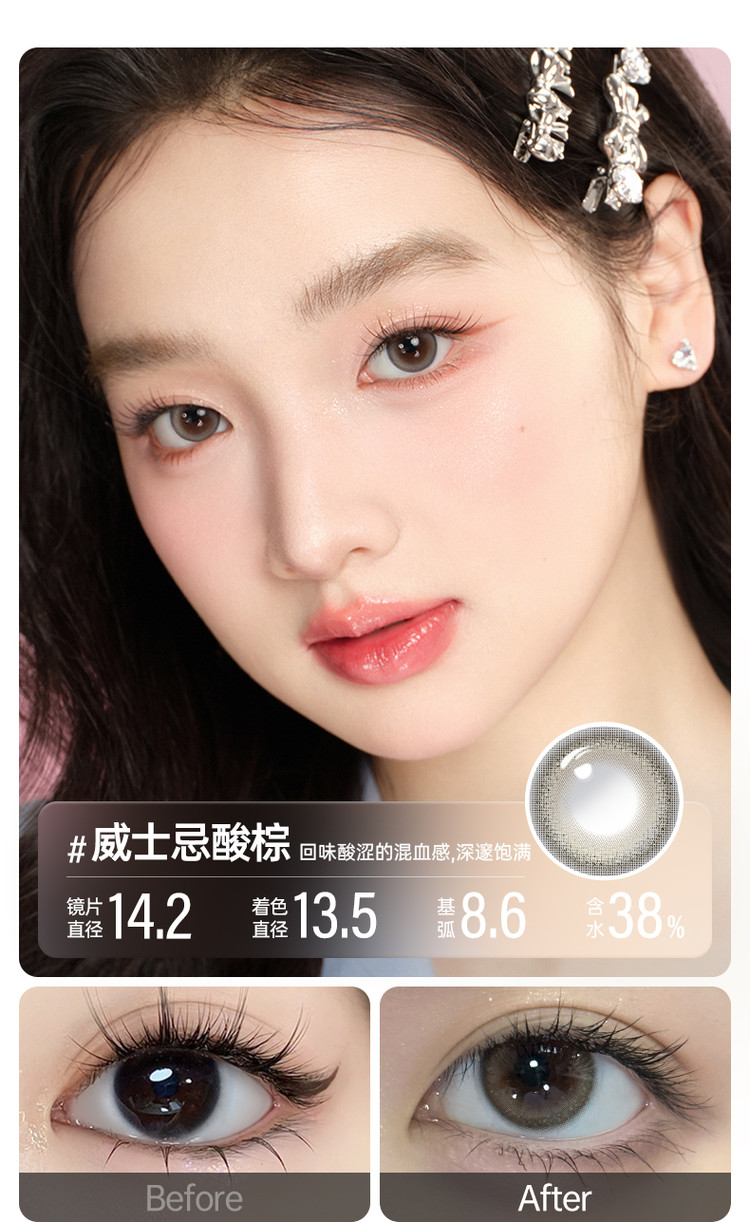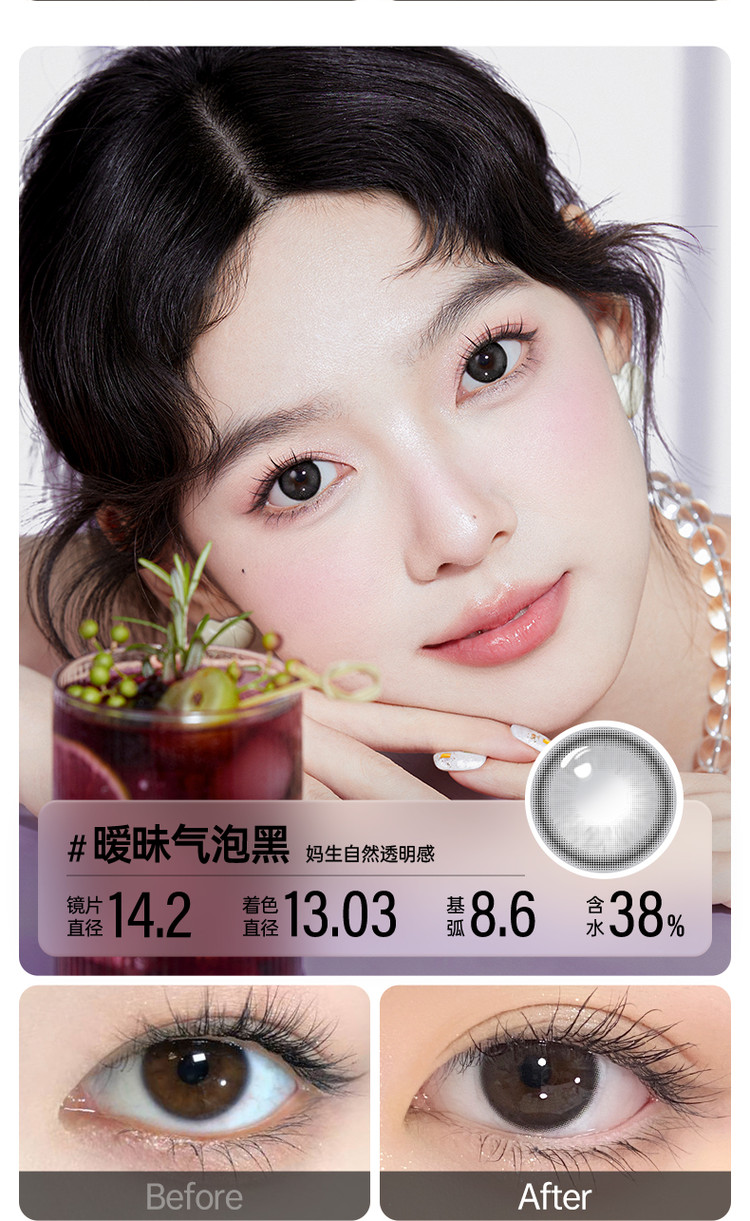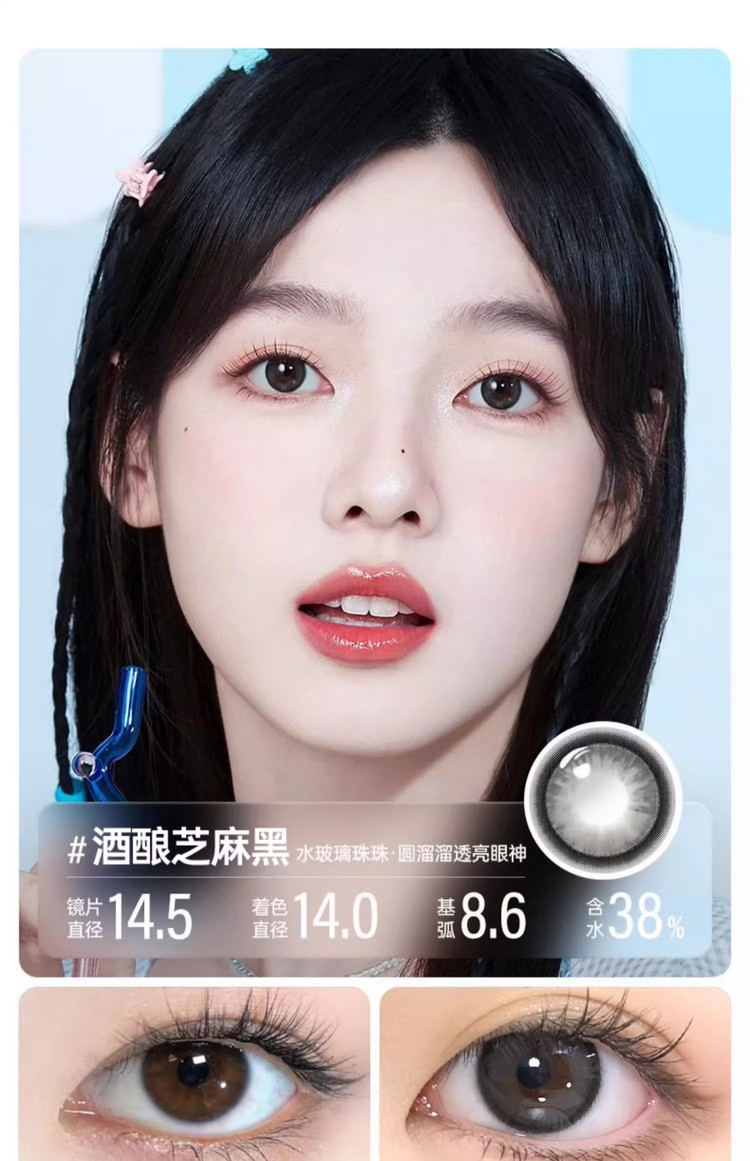 眼镜很水润戴一天都不会觉得有不舒服或者干燥,价格优惠,眼镜修饰的特别漂亮,我的左边眼镜就是佩戴后的效果,比右边眼睛还要有神