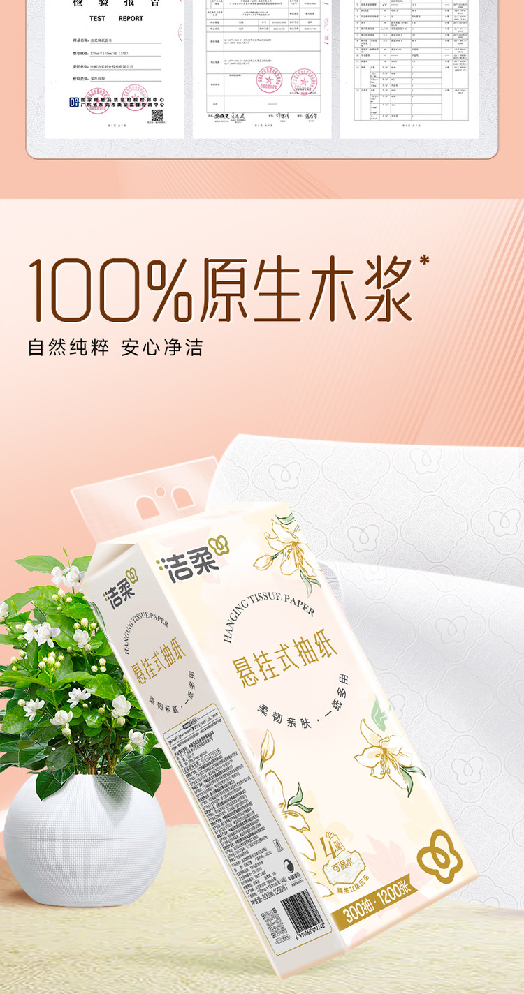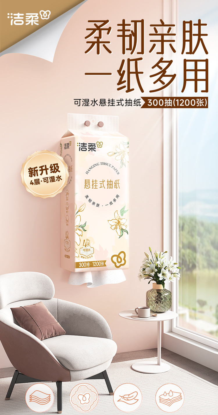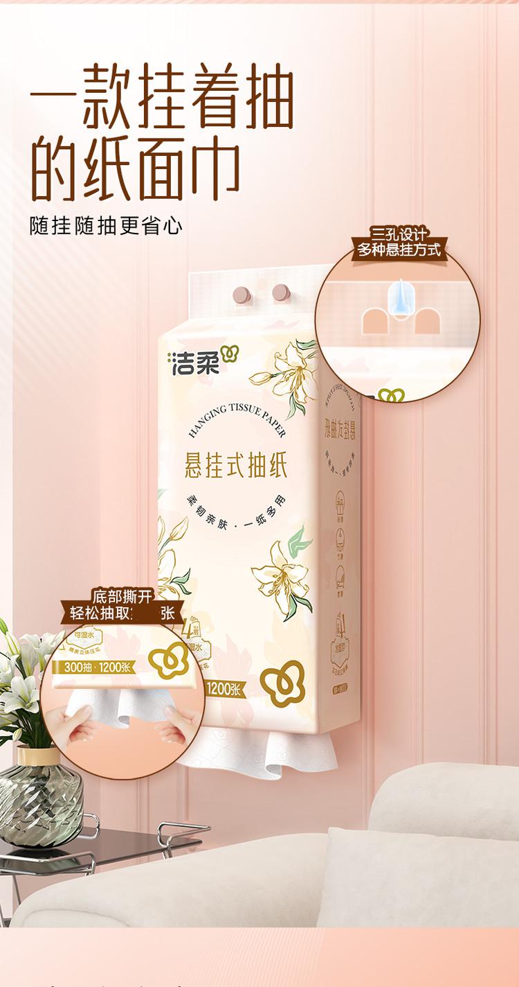洁柔悬挂抽纸太实用!1500抽大容量,四层厚实柔韧,湿水不易破、不掉屑。随心挂不占空间,抽取顺畅,家用超省心,性价比高,无限回购!