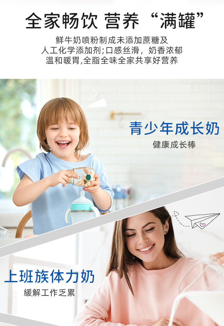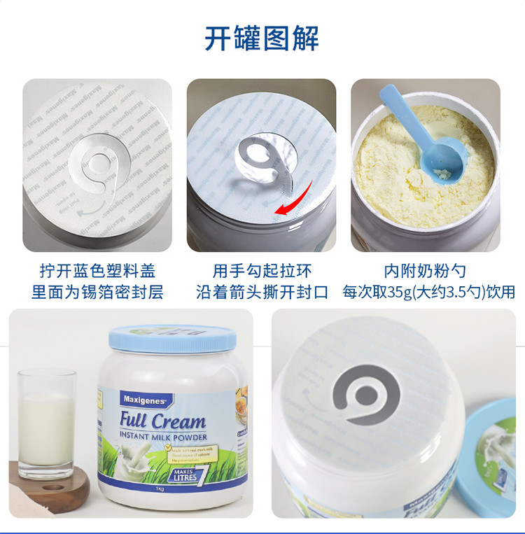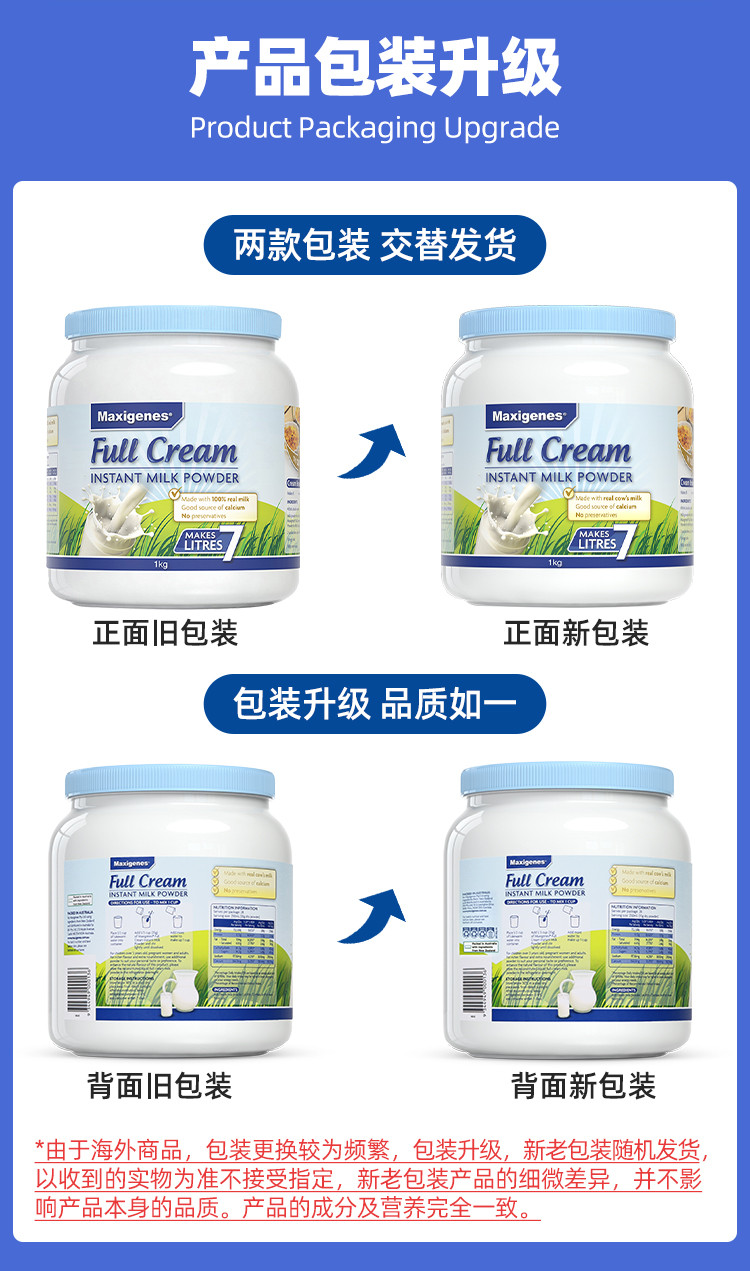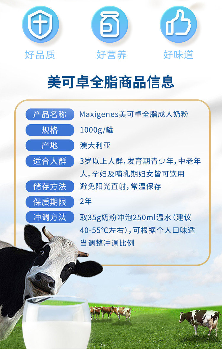 返拍多次,这款Maxigenes全脂即溶奶粉真的让我很惊喜!首先是包装设计很清爽,蓝白配色看着就干净,那个牛奶飞溅的图案特别有活力。开罐后闻到很纯正的奶香味,粉质细腻,按说明冲泡溶解很快,完全不结块。 口感非常接近鲜奶,香醇顺滑,没有那种人工香精的味道。我家孩子本来不爱喝奶粉,这款他居然主动要喝。早上泡一杯搭配早餐,或者晚上睡前喝都很舒服。看了配方用的是真正的牛奶,钙含量高还没防腐剂,给孩子喝也更放心。 1kg的大罐装很实在,标注能冲7升奶,性价比超高。盖子密封性很好,取用方便。已经回购第二罐了,全家都爱喝。如果喜欢浓郁奶香又追求天然健康,这款真的很推荐!