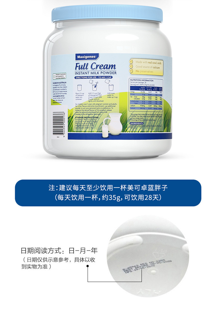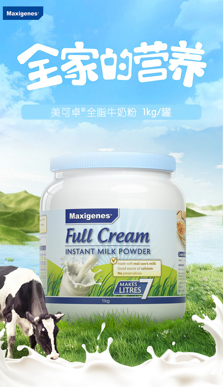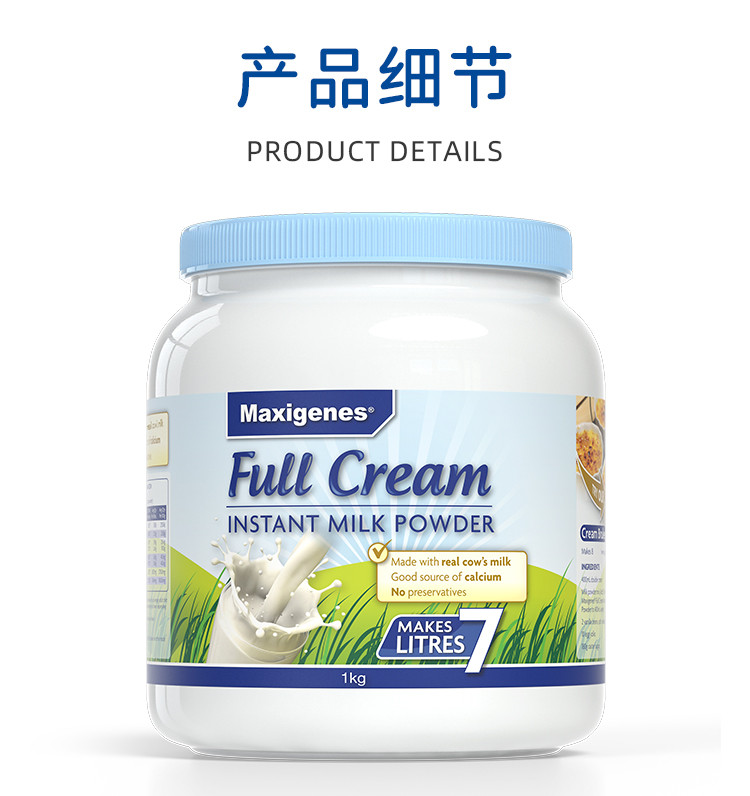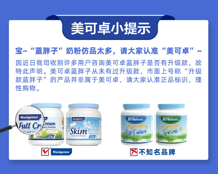 Maxigenes 澳洲进口 蓝胖子全脂成人奶粉学生奶1000g