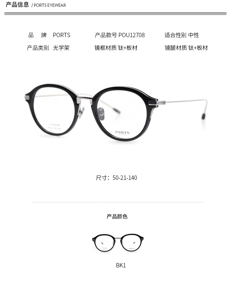 PORTS 女款日常复古休闲板材钛眼镜架POU12708