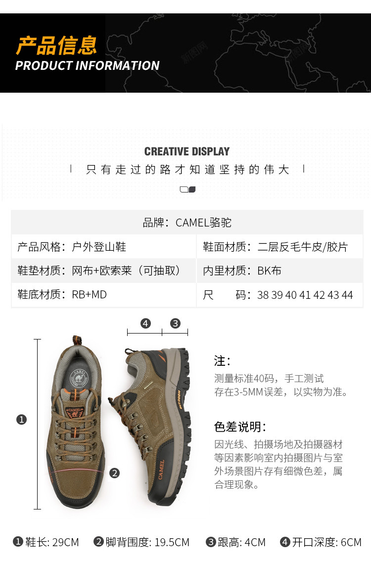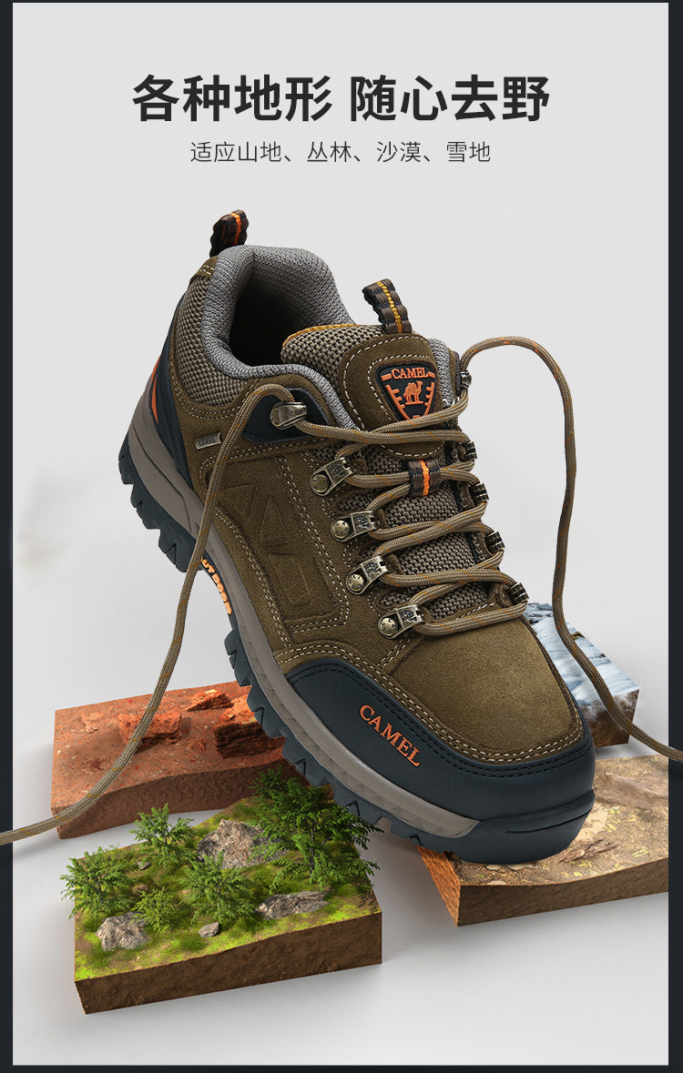 这次网购真的挖到宝了!这双camel登山鞋必须安利给你们。 周末穿着它去爬山,全程轻松无压力。鞋面是高品质材料,透气又防水,走了很久脚也没闷热出汗,途中遇上下小雨,鞋子也没湿,防水性能超赞。鞋底的纹路设计合理,抓地力强,在陡峭和湿滑的山路上行走都稳稳当当,给足了安全感。而且它的包裹性很好,贴合双脚,不会磨脚。 款式简约大方,日常穿也很合适。camel不愧是大品牌,品质一如既往地靠谱,性价比超高,准备再给媽媽再入手一雙。