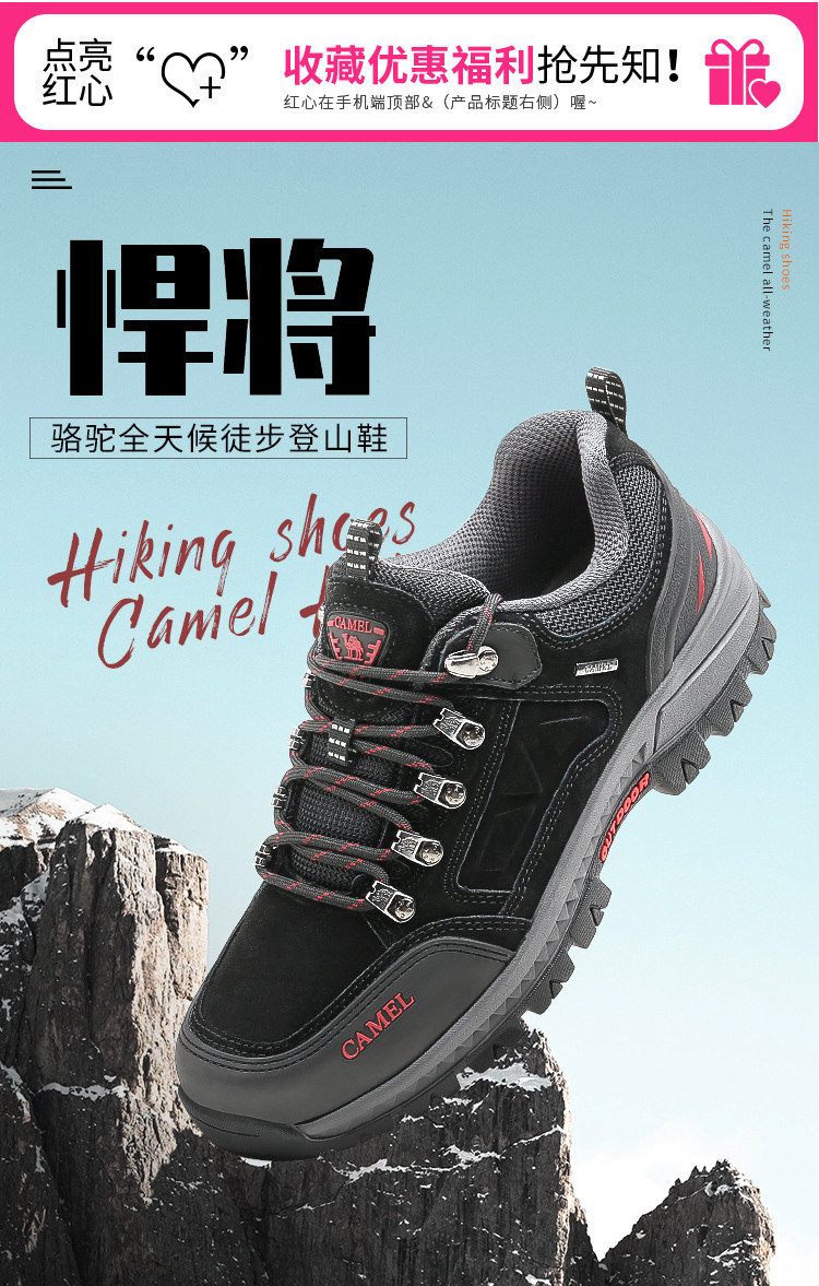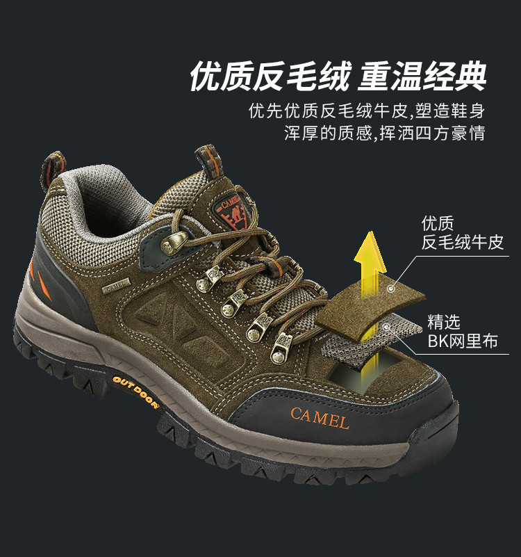这次网购真的挖到宝了!这双camel登山鞋必须安利给你们。 周末穿着它去爬山,全程轻松无压力。鞋面是高品质材料,透气又防水,走了很久脚也没闷热出汗,途中遇上下小雨,鞋子也没湿,防水性能超赞。鞋底的纹路设计合理,抓地力强,在陡峭和湿滑的山路上行走都稳稳当当,给足了安全感。而且它的包裹性很好,贴合双脚,不会磨脚。 款式简约大方,日常穿也很合适。camel不愧是大品牌,品质一如既往地靠谱,性价比超高,准备再给媽媽再入手一雙。