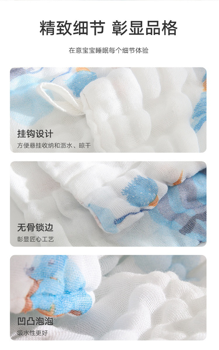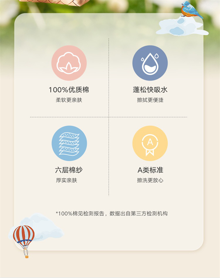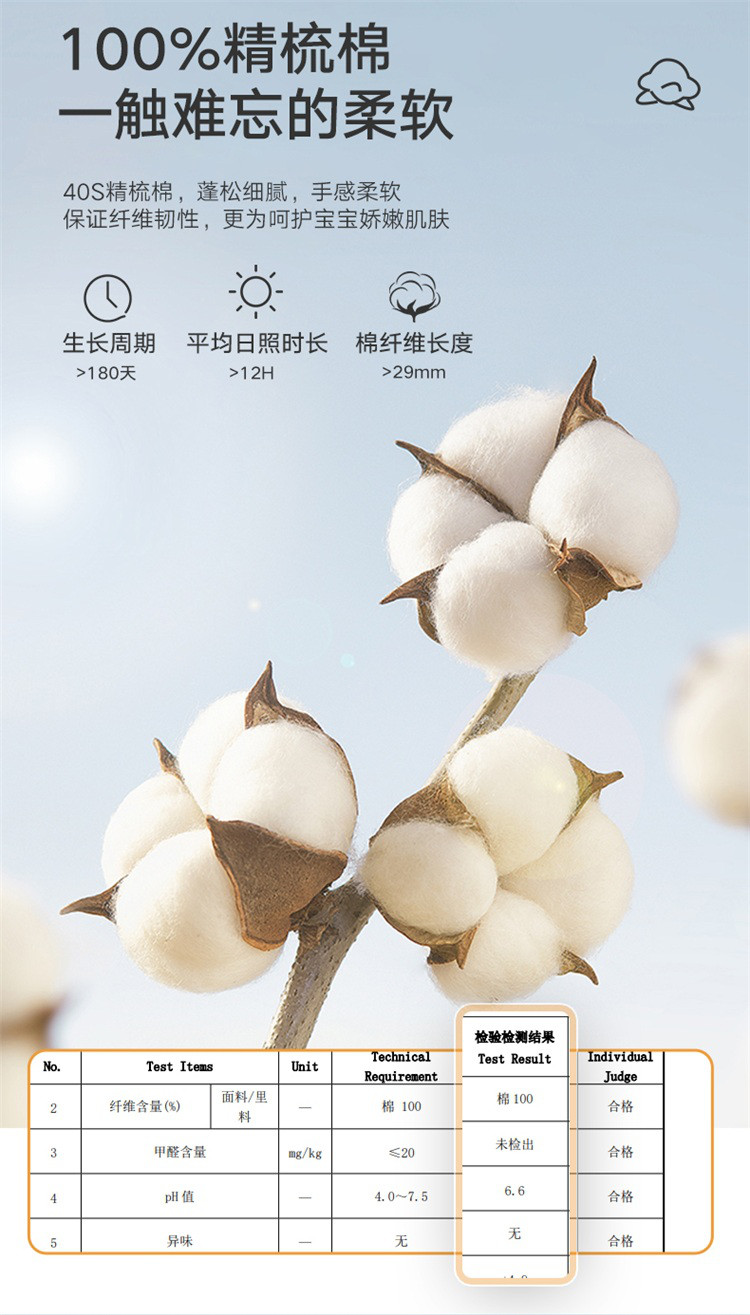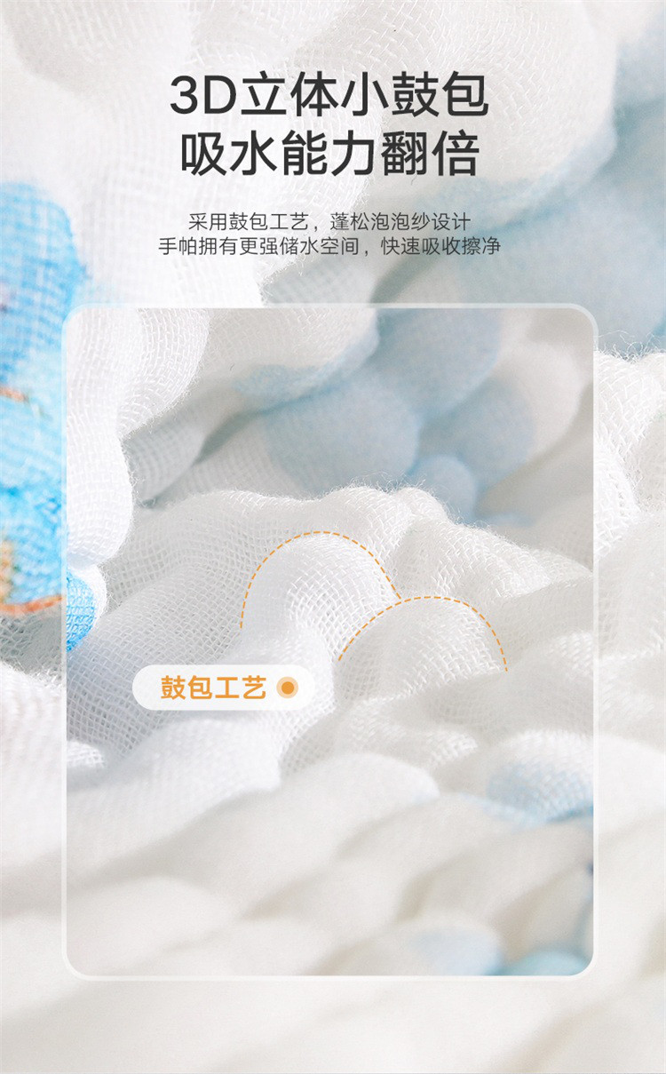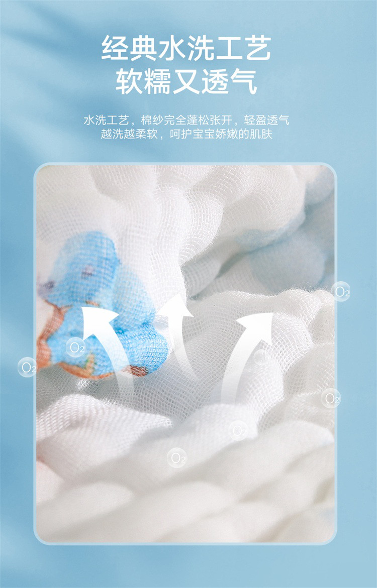 纯棉材质柔软亲肤,接触皮肤时触感温和,如同被云朵轻抚,对婴幼儿及敏感肌肤人群尤为友好。 其天然纤维特性确保了使用时的无刺激性,多次清洗后仍能保持柔软质地
