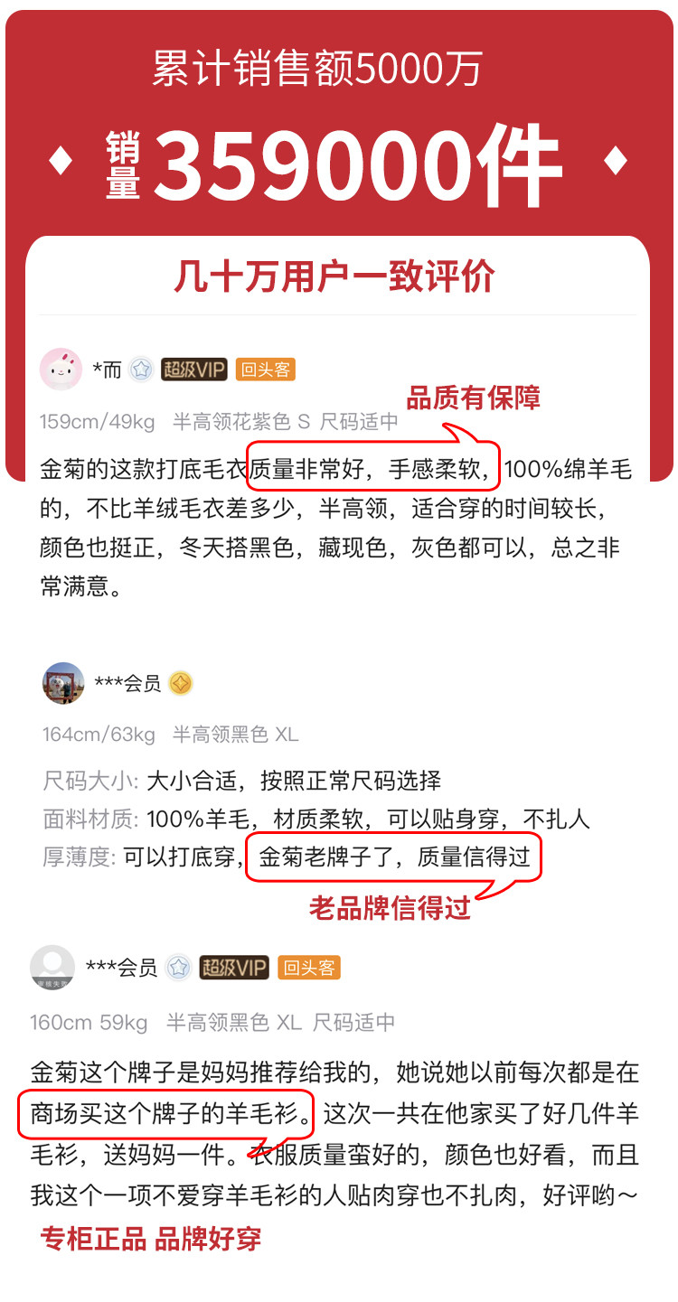 今天收到金菊羊毛衫,看到实物让震惊!质量杠杠,柔软糯糯,不薄又不厚,冬天穿了正好。不愧是上海久经不衰老品牌!太好了。客服热心,耐心,暖心解释。穿着合体,是我的菜,感谢!以后一定会继续关注金菊品牌!