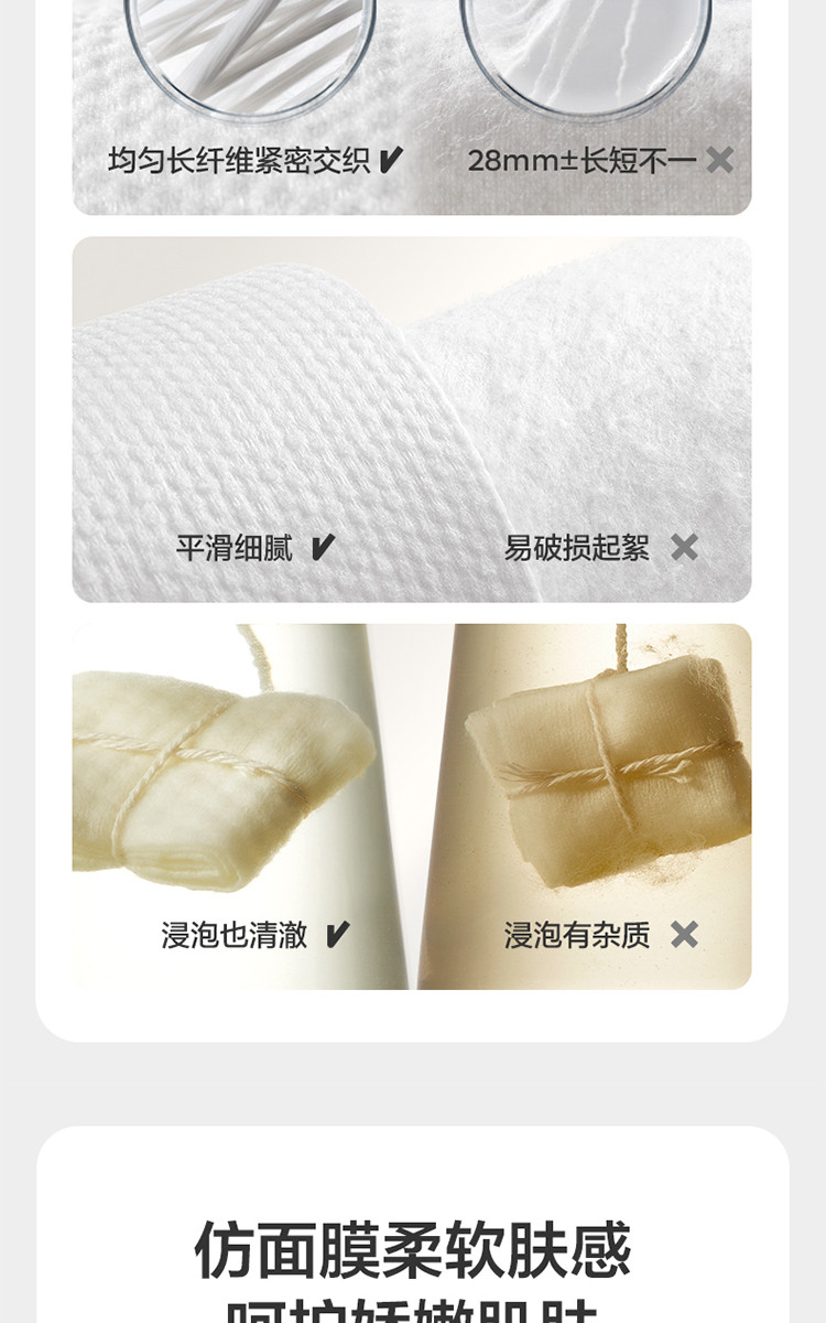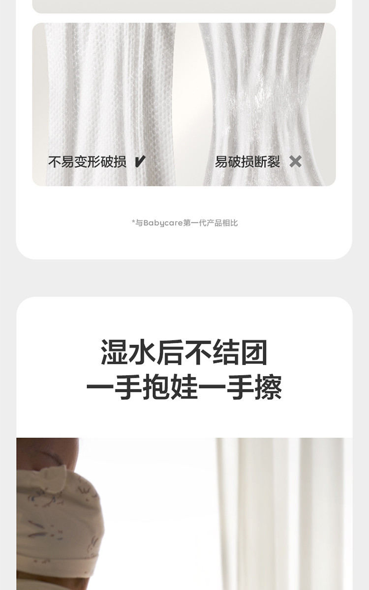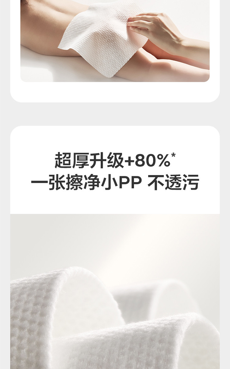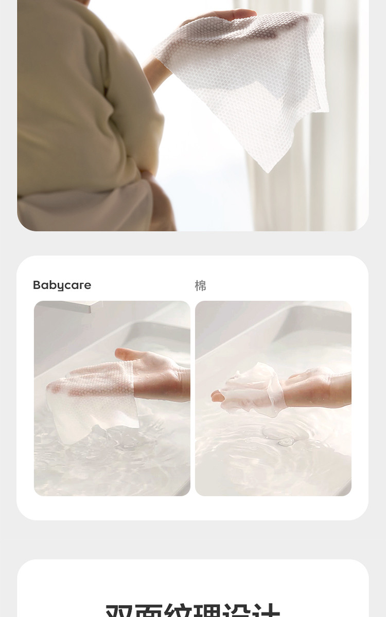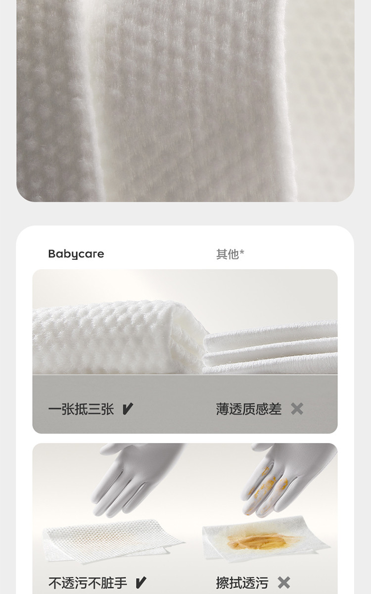 - 安全无添加,全家可用:核心系列(如小熊/兔兔)采用100%纯棉或75%粘胶+25%莱赛尔的植物纤维配方,0荧光剂、0甲醛、0香精,通过SGS等多项检测,新生儿和敏感肌均可放心使用。植物纤维款还具备可降解性,环保友好。 - 厚实柔韧,干湿两用:主打云朵加厚,部分款加厚80%,采用双面纹理(一面珍珠纹清洁,一面平纹亲肤),湿水后如小毛巾般柔软,不掉絮、不透污、不易破,擦拭宝宝屁屁或成人洗脸卸妆都很安心。
