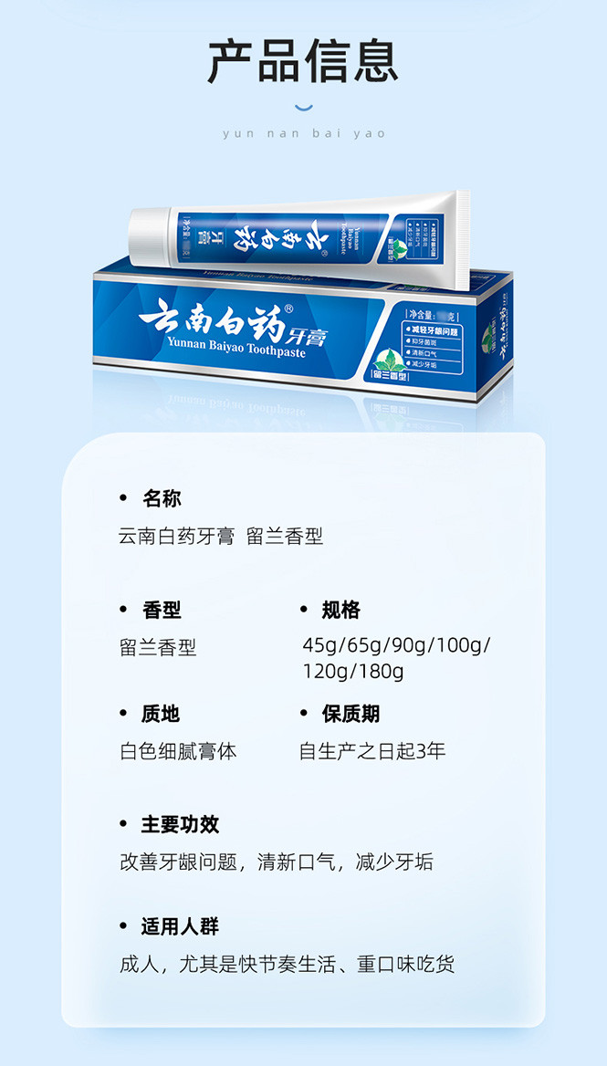 牙膏含有云南白药活性成分,刷牙时温和不刺激,膏体细腻易起泡,清洁力不错且用后不辣口,对缓解牙龈出血、红肿等问题有帮助,用后牙龈感觉更健康,留兰香型清新口气持久,早晚使用后口腔很舒(⁎⁍̴̛ᴗ⁍̴̛⁎)