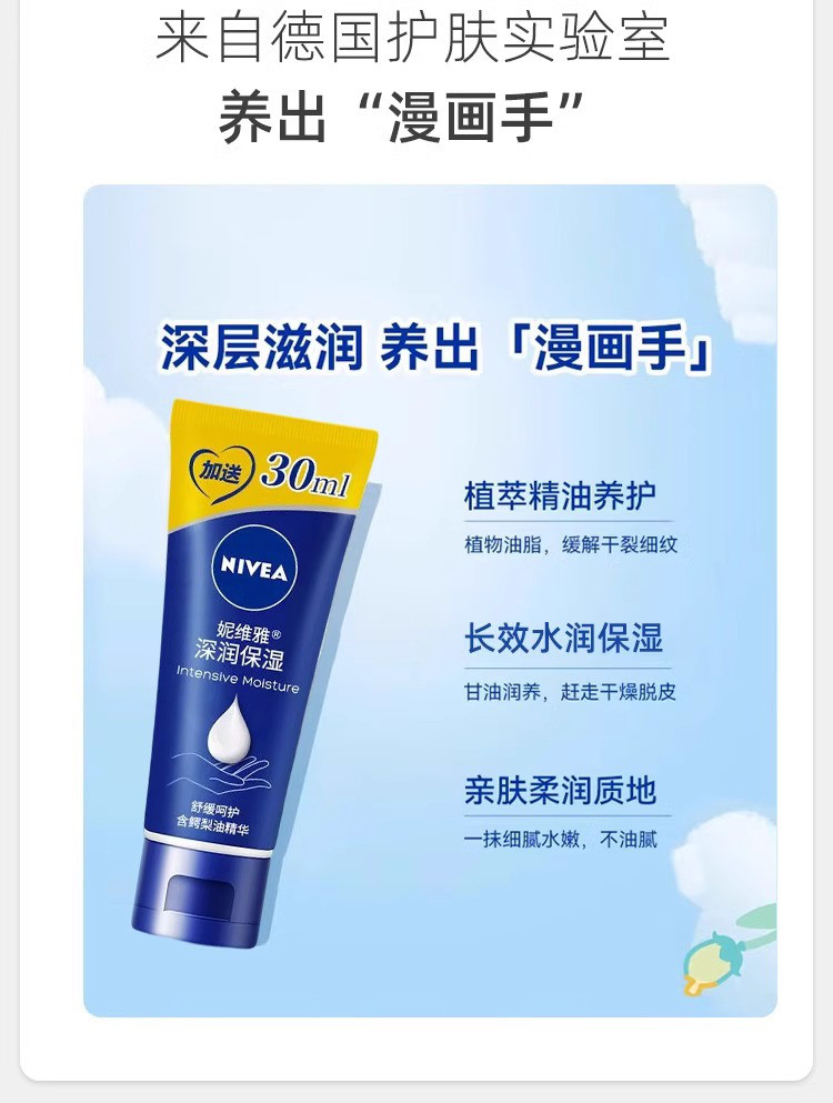 滋润效果:非常好吸收,不会油腻感,滋润清爽 味道描述:喜欢的味道 性价比:一直用妮维雅的手霜,夏天用海洋,冬天用滋润