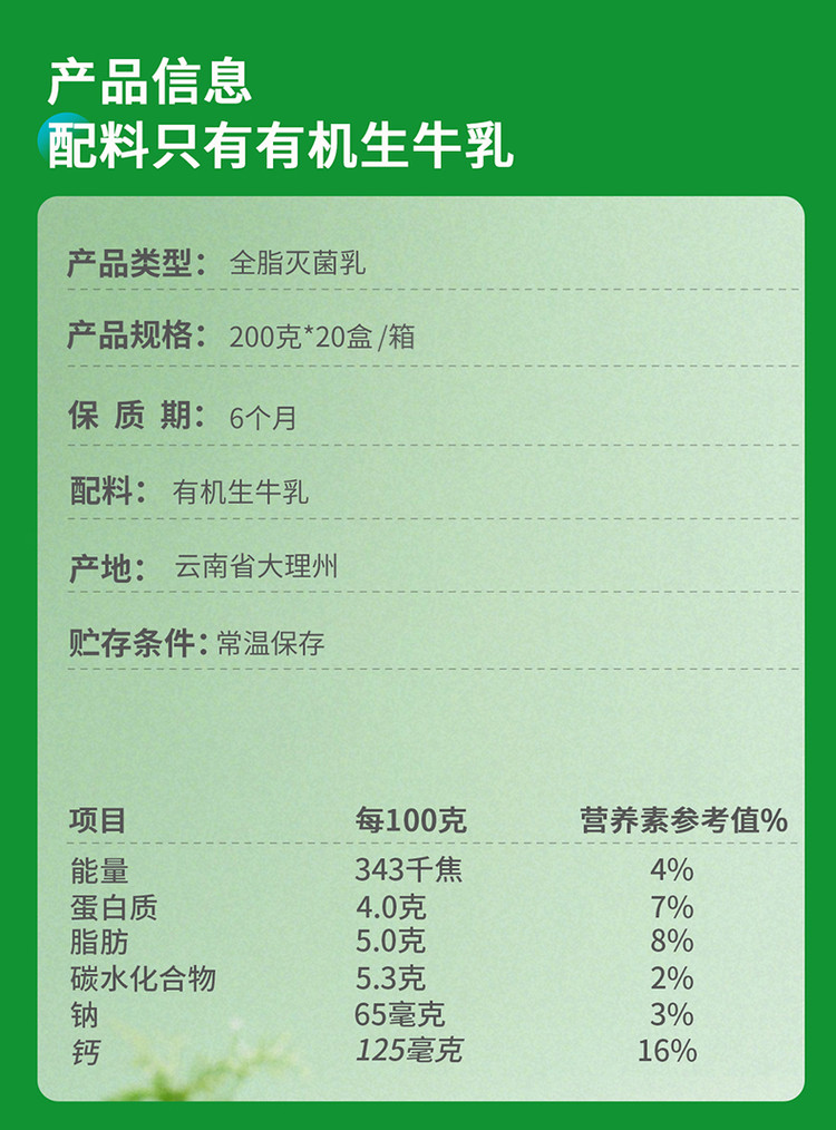 1:有机牛奶,口感独特,香味浓郁! 2:大品牌,质量值得信赖! 3:日期新鲜,值得推荐 唯品会自营商品,买着放心,吃着安心!值得信赖!