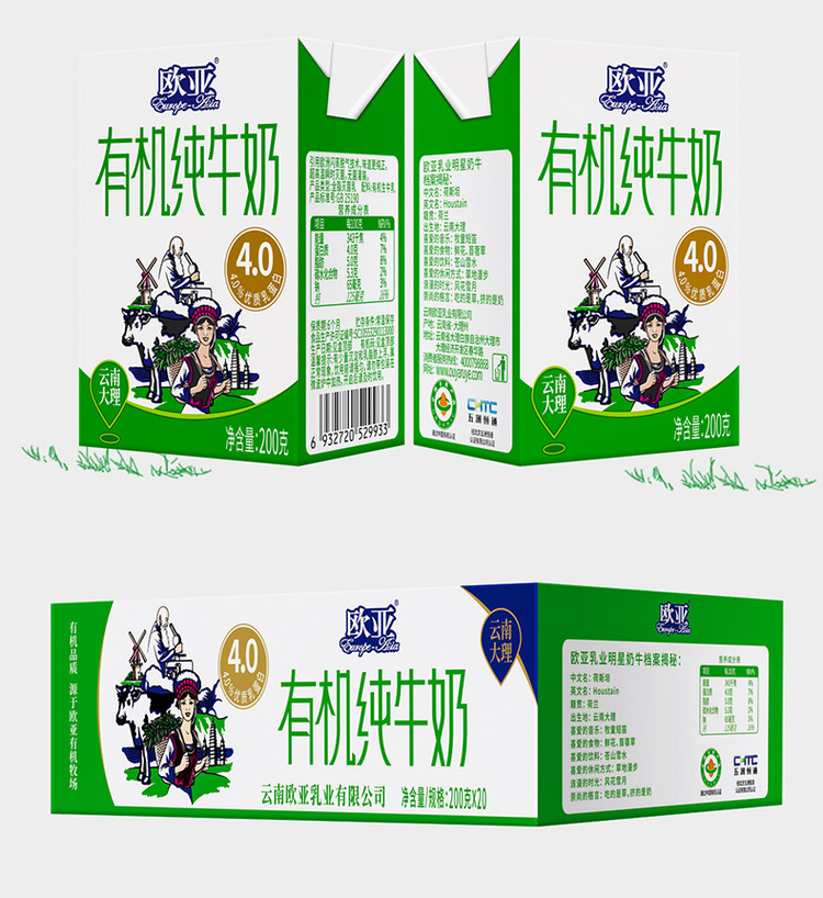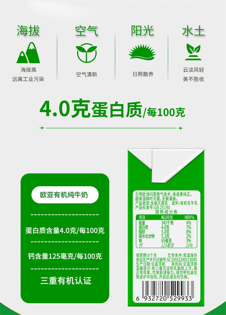 欧亚 高原全脂有机4.0蛋白纯牛奶200g*20盒*1箱早餐