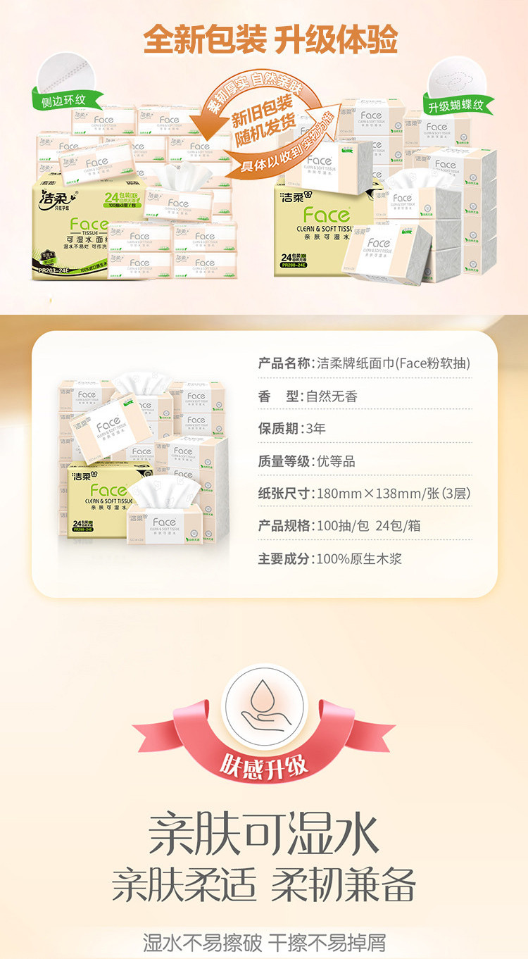 洁柔 【镇店之宝】洁柔粉face抽纸30/24/10包餐巾实惠家用面巾卫生纸